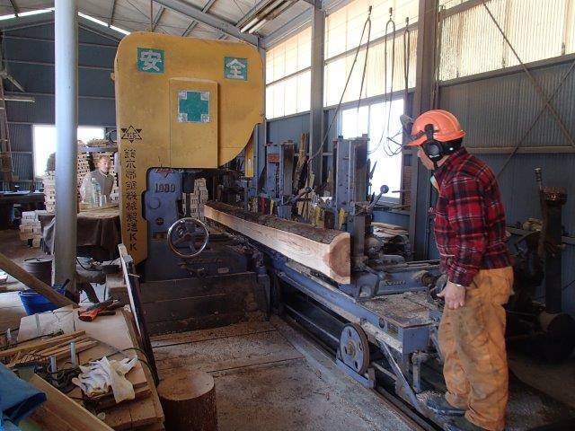 製材機としては、広葉樹を挽く能力のある機械です。太さ3尺、長さは7mまで対応します。賃挽きも請けます。木材の乾燥については、AD(天然乾燥)の他、TCR(熱化学還元処理:野村隆哉先生の特許です)処理を施した木材もあります。